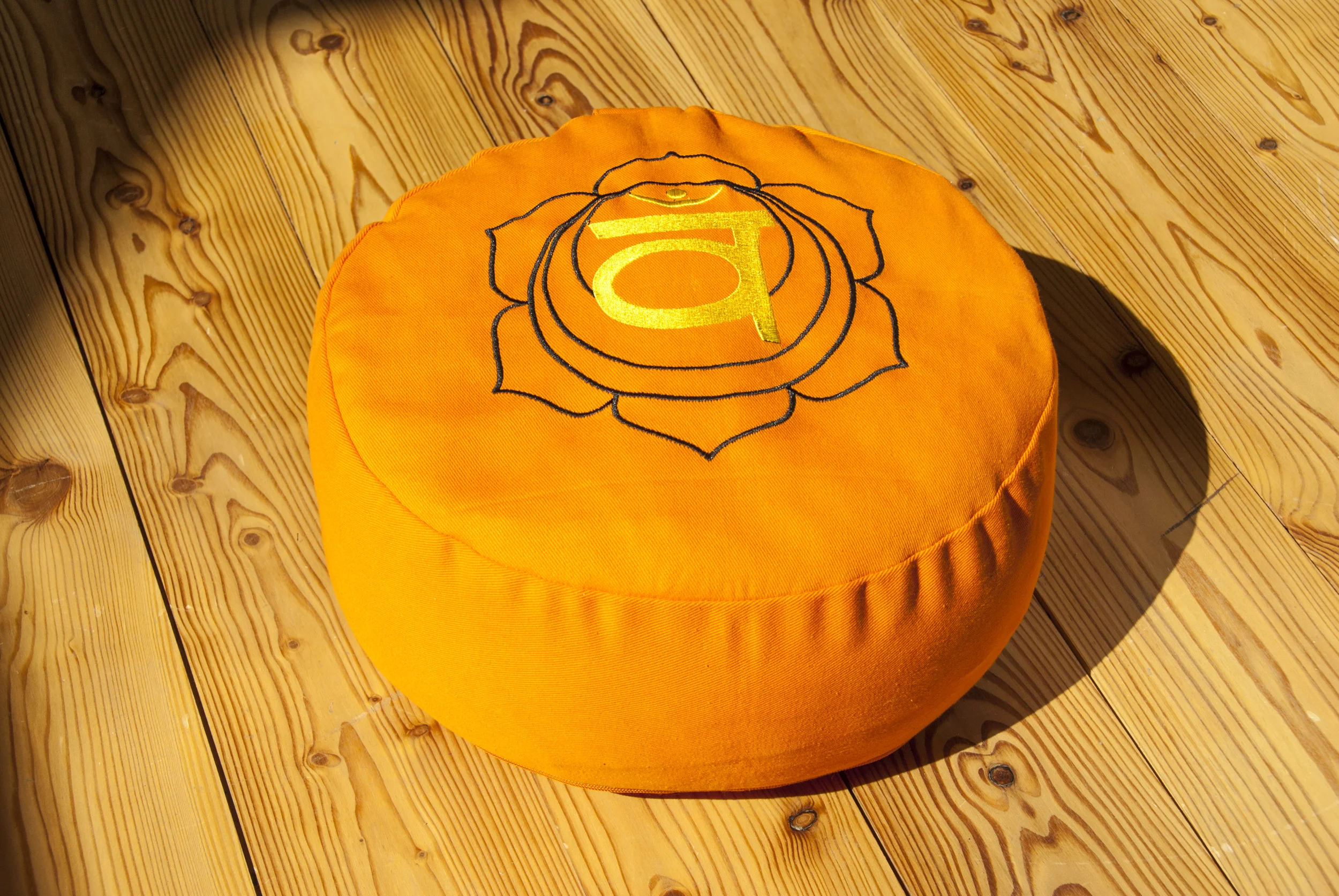 Gefülltes Chakra Meditationskissen mit orangem Bezug und Sakralchakra-Stickerei. Ideal zur Unterstützung von Hingabe, Kreativität und innerer Zufriedenheit. Waschbarer Baumwollbezug mit Reißverschluss, Füllung aus Buchweizenspelz.