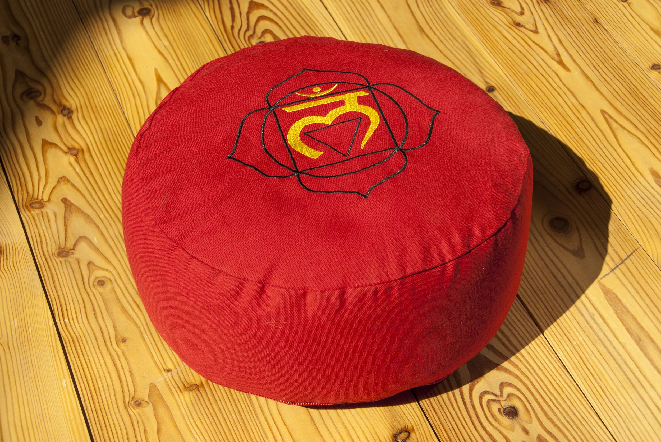 Dieses hochwertig verarbeitete Meditationskissen ist dem Wurzelchakra (Muladhara) zugeordnet. Die rote Farbe und die goldfarbene Stickerei wirken unterstützend auf die innere Stabilität, Erdung und Sicherheit. Perfekt für Yoga, Achtsamkeit und Meditation.